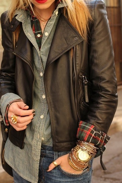 Один яркий акцент в тон куртке добавит луку неординарности. Это может быть браслет или шарф. Главное не использовать больше акцентов, чтобы образ выглядел неперегруженным. Также можно носить украшения белого, серого или чёрного цвета.
